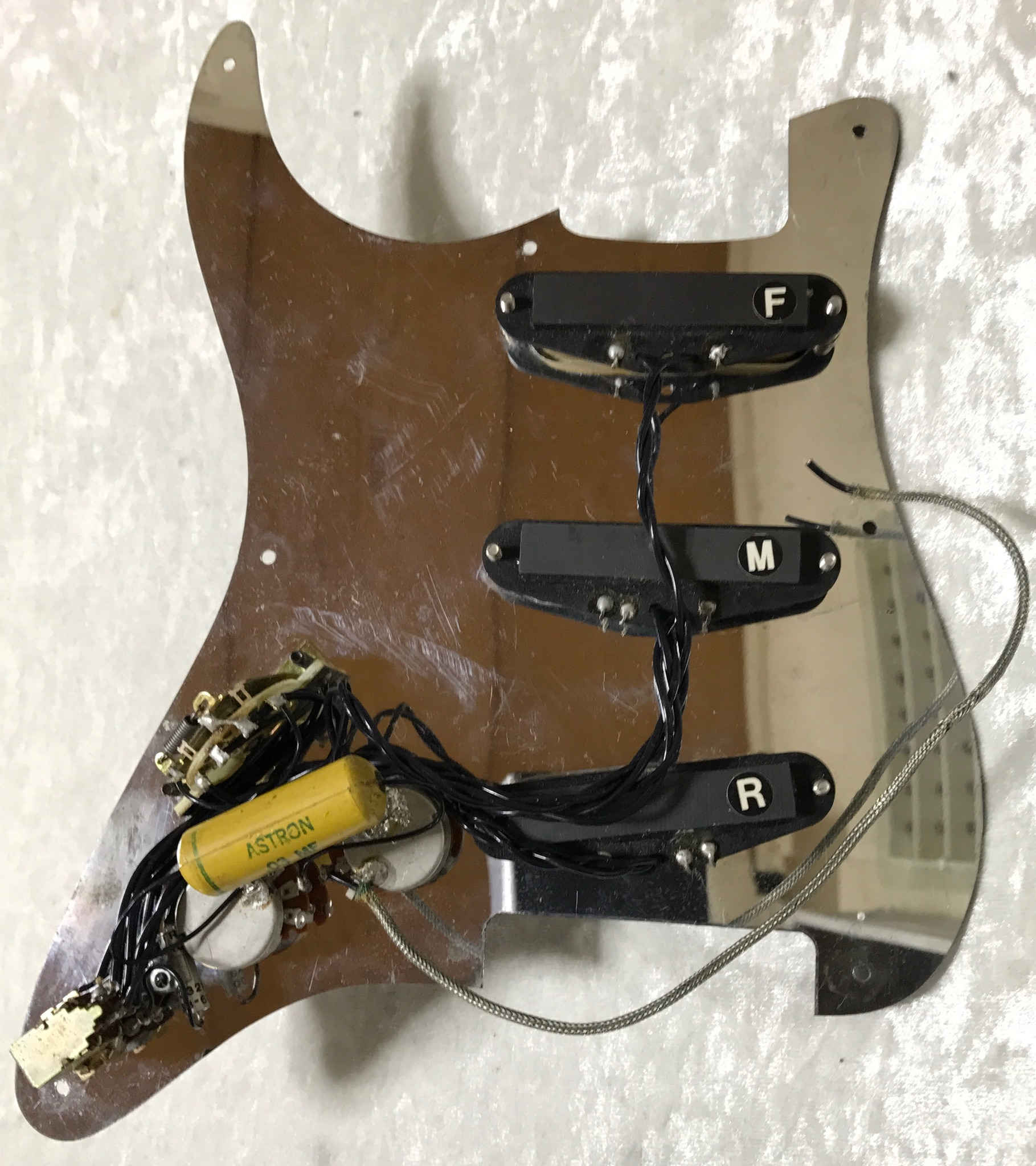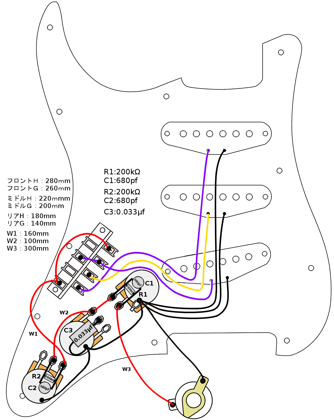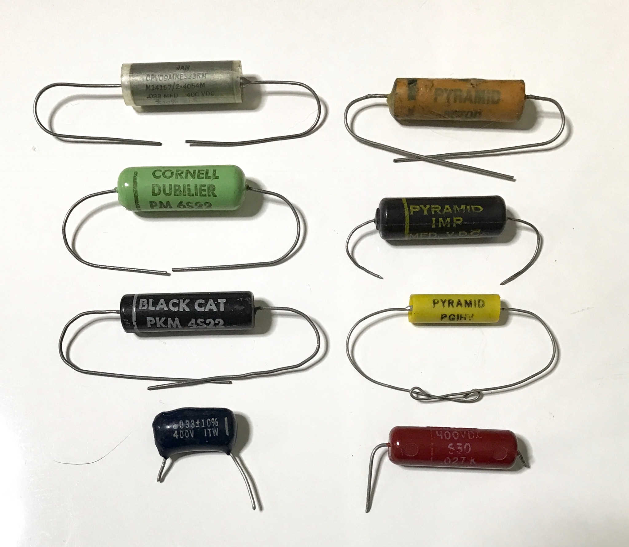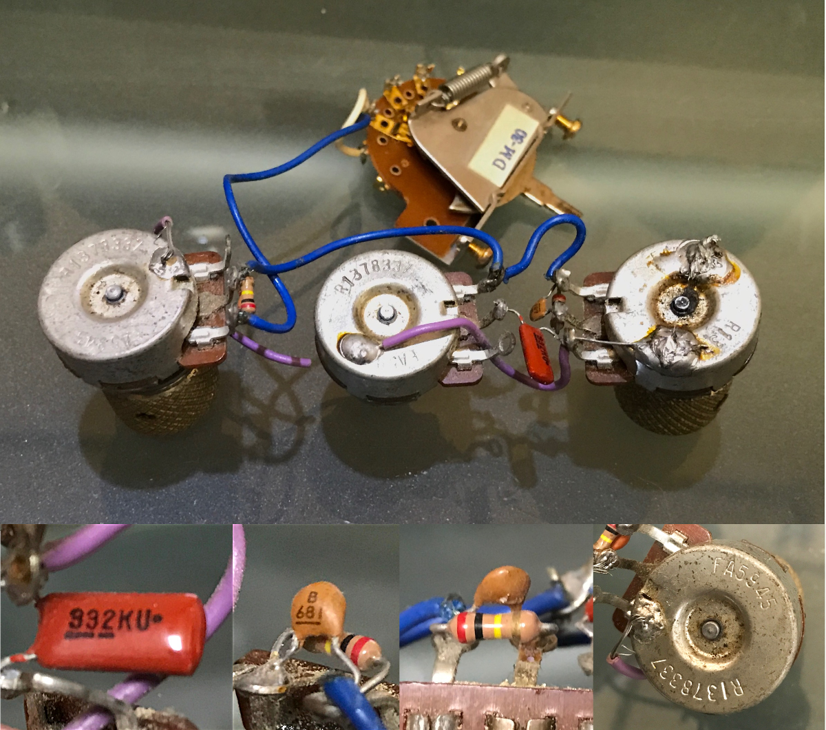 内部配線は同じくBelden 28AWG を6本撚り合わせた20AWG、 アウトプット部分にとりあえず的なHOLYOKE 20AWG 撚り線。 他にROEBLING、SEL、REA、秘蔵のAnsoniaなども試してみます。 #トーン用キャパシタには手持ちの0.033μfで良さそうなのをいくつか。Cornell Dubilier、TRW、PYRAMID、ITWなど。 #ハイパスフィルター、ローカットフィルター用のセラミックコンデンサー680pfは正直音にどう影響するのかわからないので手に入るところから適当に購入。初代SCHECTERについてたのと同じTDK(?)のものにする必要はないのですが何故か売っていたのでそれも買ってみました。 #抵抗はビンテーマーシャルに実際に使われていたものと同じBeyschlag200kΩ。 何故かよく使いそうな200kがこれしかなかった。