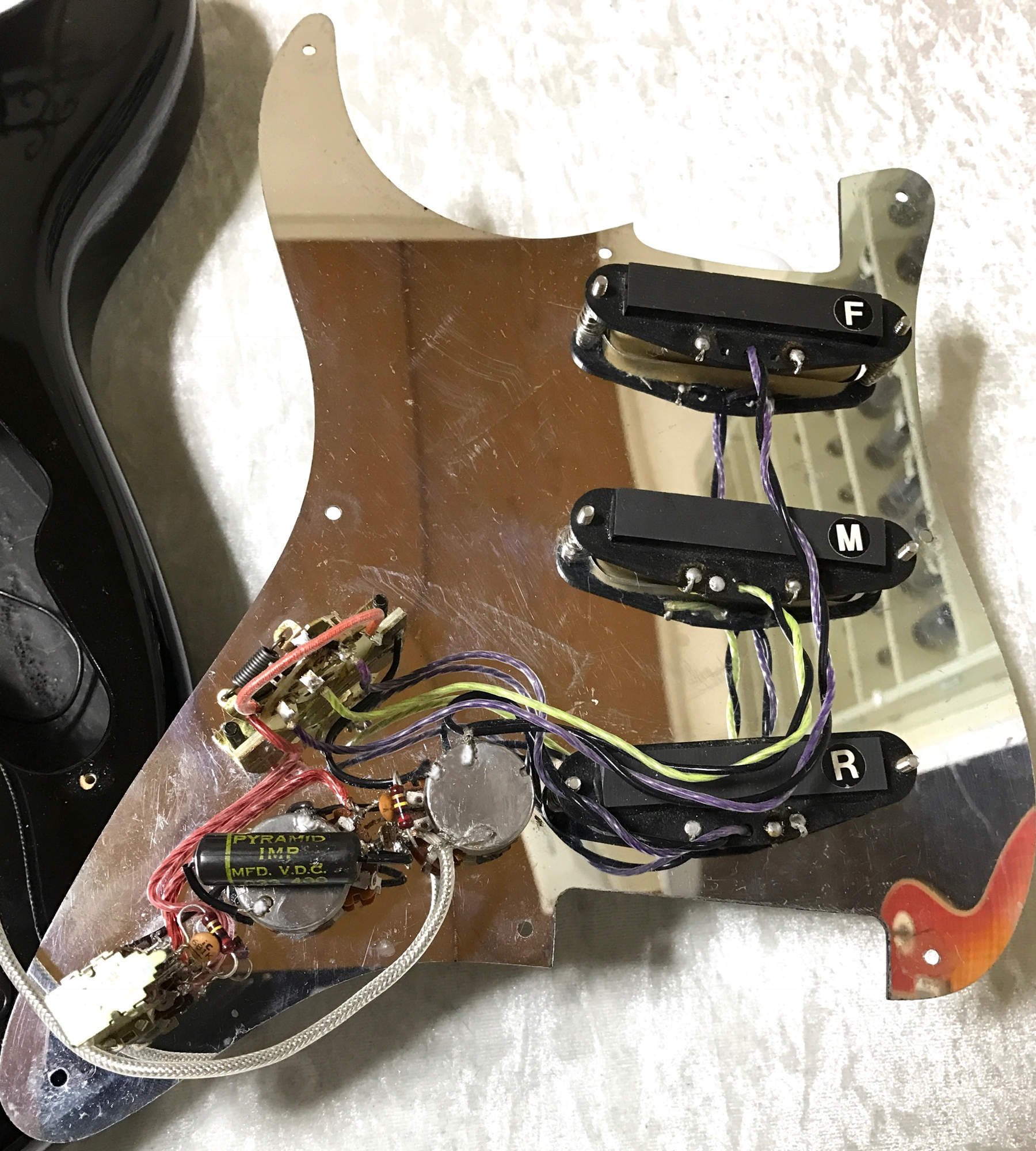 リード線は4本撚りにしてオリジナルのMonsterToneのリード線色に合わせて、正巻コイルの紫と逆巻コイルの黄に、セレクター以降は赤に着色。 | シングルコイルのリード線交換はとても繊細な作業なので緊張しましたが、無事にリード線交換とTap線除去できました。 |
