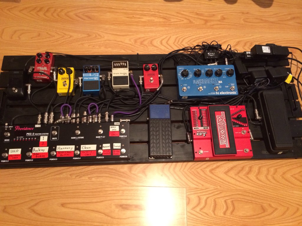 皆様、お久しぶりです。Kendohです。 やっと今年のお盆も終わりましたね。 今年は台風の影響で天気が大荒れでしたが、その代わりに結構涼しかったので身体的には楽だったと思います。 さて、最近全く更新されていないこのブログ・・・何かしら記事は無いかと思い、考えた結果・・・また私の機材紹介をしたいと思います。 以前自作のスノコ製自作エフェクターボードを紹介しましたが、今回はそのボードの内容が少々変わりましたので、紹介したいと思います。 とりあえずこんな感じ。 並び順と接続順は一緒ではありません。 ループスイッチャーを利用して2回路作っています。 このPEC-2というループスイッチャーは全部で8個のエフェクターを接続でき、更にチューナーアウトが付いているので、そこにチューナーを接続します。 1〜5番は直列で6〜8番はそれぞれ独立していてそれぞれイン、アウトジャックが付いています。 1. ギター→バッファーIn→ワウ→ワーミーDT→ハーモニスト→ディストーション→コンプレッサー→Out→ヴォリューム・ペダル→アンプ 2. Send→グラフィック・イコライザー→ディレイ+ルーパー→リヴァーブ→Return こんな感じで接続しています。 数が増えたので、ヴォリューム・ペダルはループスイッチャーの外に接続することにしました。 実は先日、義弟より誕生日プレゼントとしてtc electronicのflashback×4というディレイ+ルーパーを貰ったのです‼︎ 写真で言うと青いでっかいやつです。 喜んで組み込んでみました( ̄▽ ̄) ディレイとはやまびこみたいに音が繰り返す用な効果があります。 ルーパーは、私のFlashback×4は最大40秒録音できて、それを再生しながらギターを弾けます。 1人でハモったりバッキングを録音してその上にソロを乗せたり、色々使えます。 まだスタジオで鳴らしたことが無いので楽しみにですね(^^) 結構スノコボードを作りたいなぁ、という方が多い様なので、参考までに私のボードの作り方を載せてみましょう。 ホームセンターで自分に必要な大きさのスノコ、ラッカースプレー(好みの色で)、取っ手×2、マジックテープを1〜2メートルくらい(cm単位で切り売りしてくれます)、後は結束バンドを買ってきます。 ¥2,000〜¥3,000くらいで買えるのではないでしょうか? 床に置いた時に床に色が着かない様にスノコの底にガムテープで目張りをして着色しない様にします。 スプレーして乾いたら、取っ手をネジで取り付けます。 写真でも拡大して見てみると、左右に取っ手が取り付けてあるのが確認できると思います。 エフェクターはマジックテープで固定します。 ワウだけは重かったので、ネジで固定しています。 シールドやケーブル類を結束バンドで固定します。 ザッとこんな風に制作しました。 接続が変われば配線も変わるので組換えするのは結構な作業になりました(^_^;) シールドも何本かは切ってハンダで繋げて長さを調整しています。 接続順に関しては一応セオリー通りですかね。 イコライザーはアンプの前に繋ぐのとセンド・リターンに繋ぐのとで効果が違います。 私はブースター的に使用したかったのでセンド・リターンに繋いでいます。 ディストーションはクランチ用です。 もうしばらくは変化がないでしょう・・・そしてしばらくはこの作業はしたくない(笑) ともかく、次回スタジオで新生エフェクターボードを試すのが楽しみにですね\m/( ̄ー ̄)\m/ それではまた。 乱雑な長文失礼致しました。 |