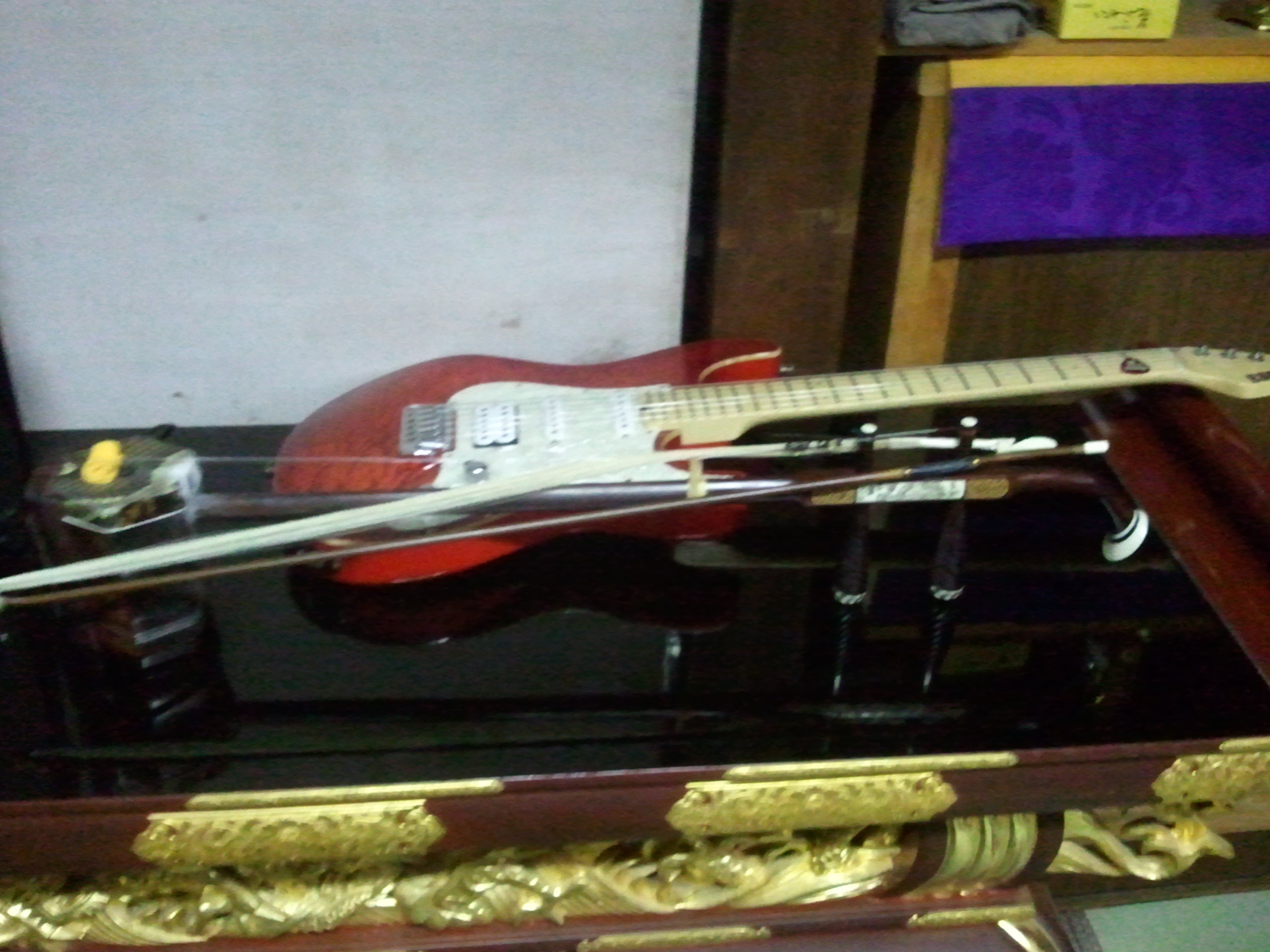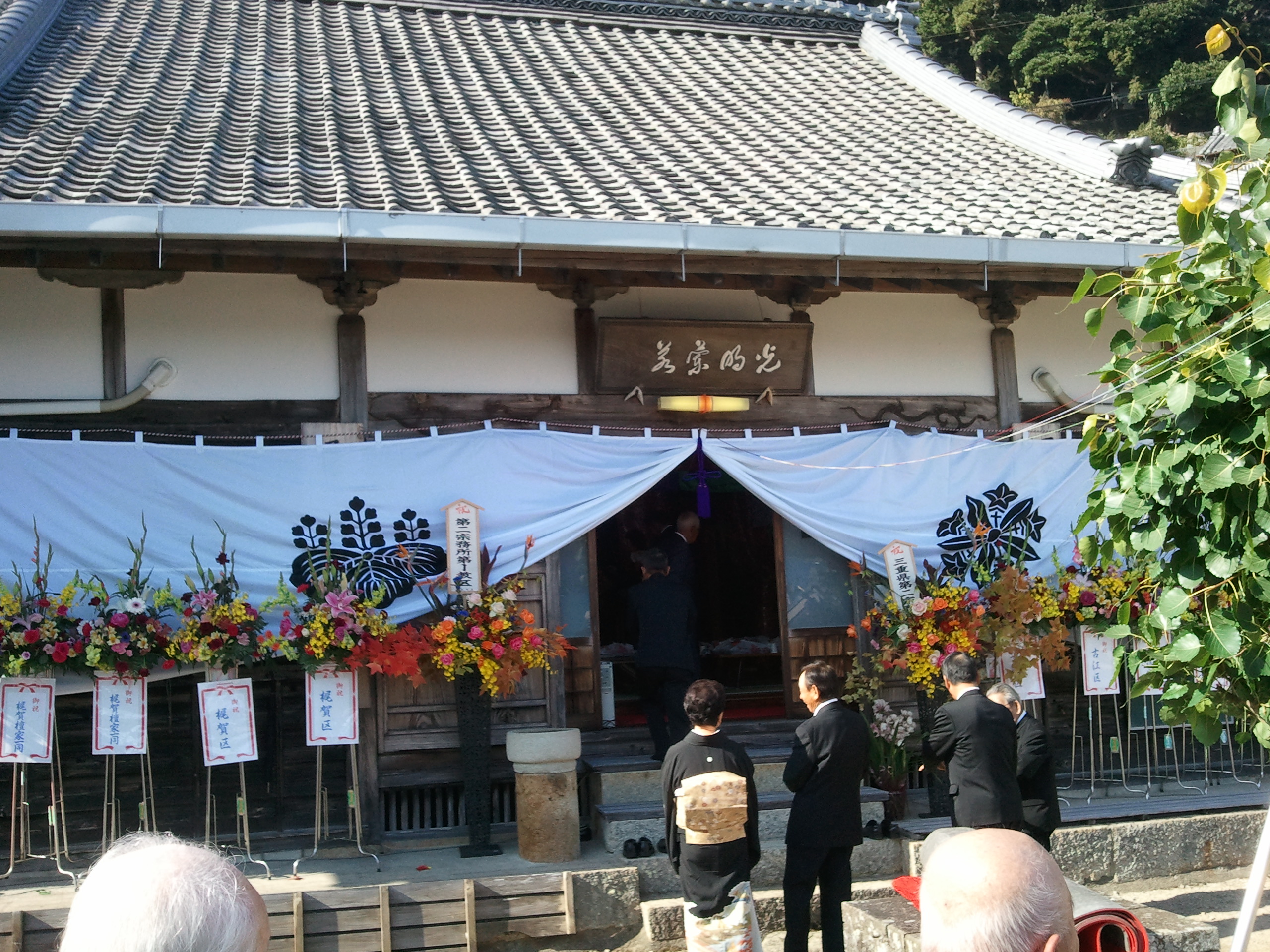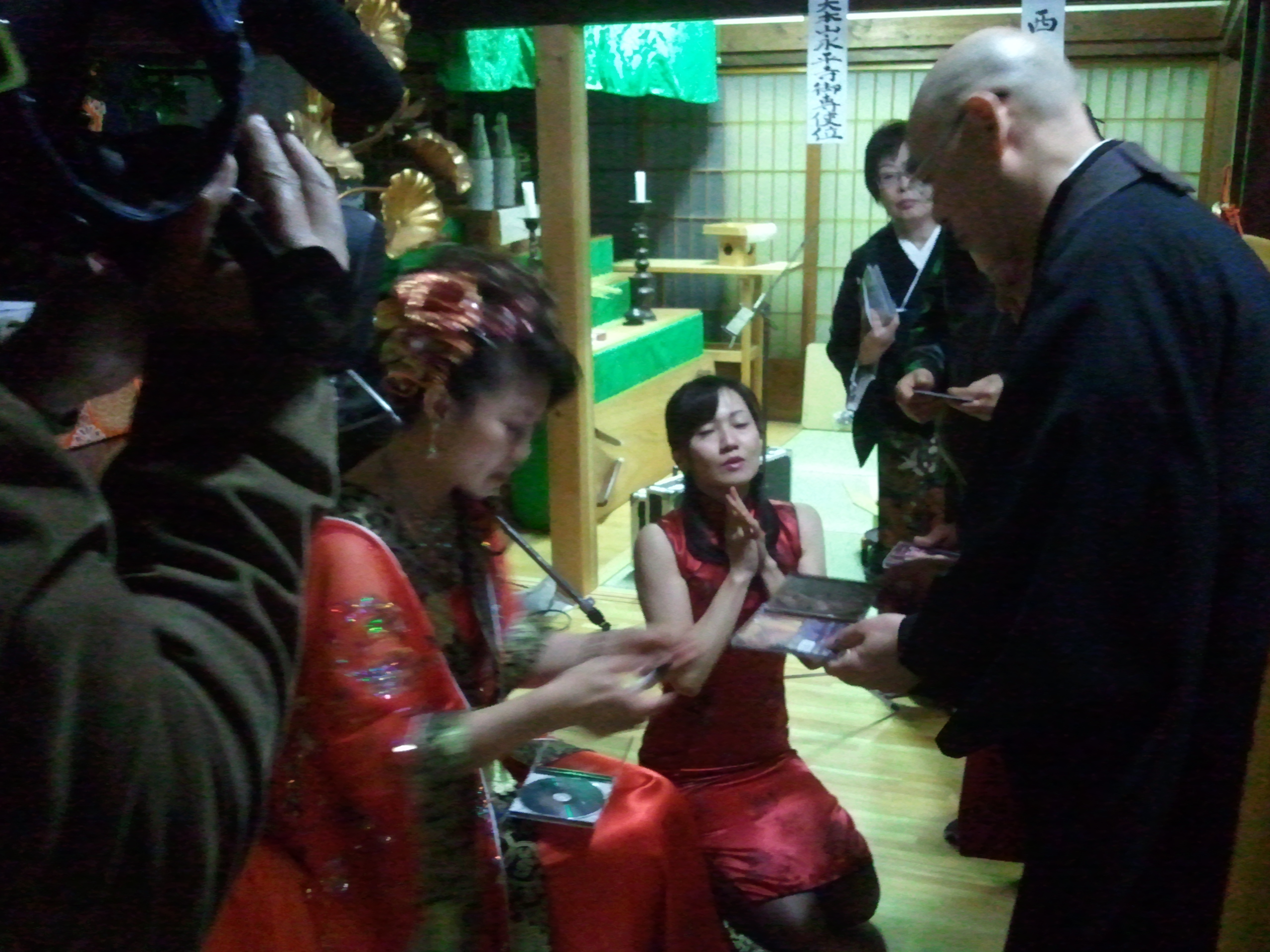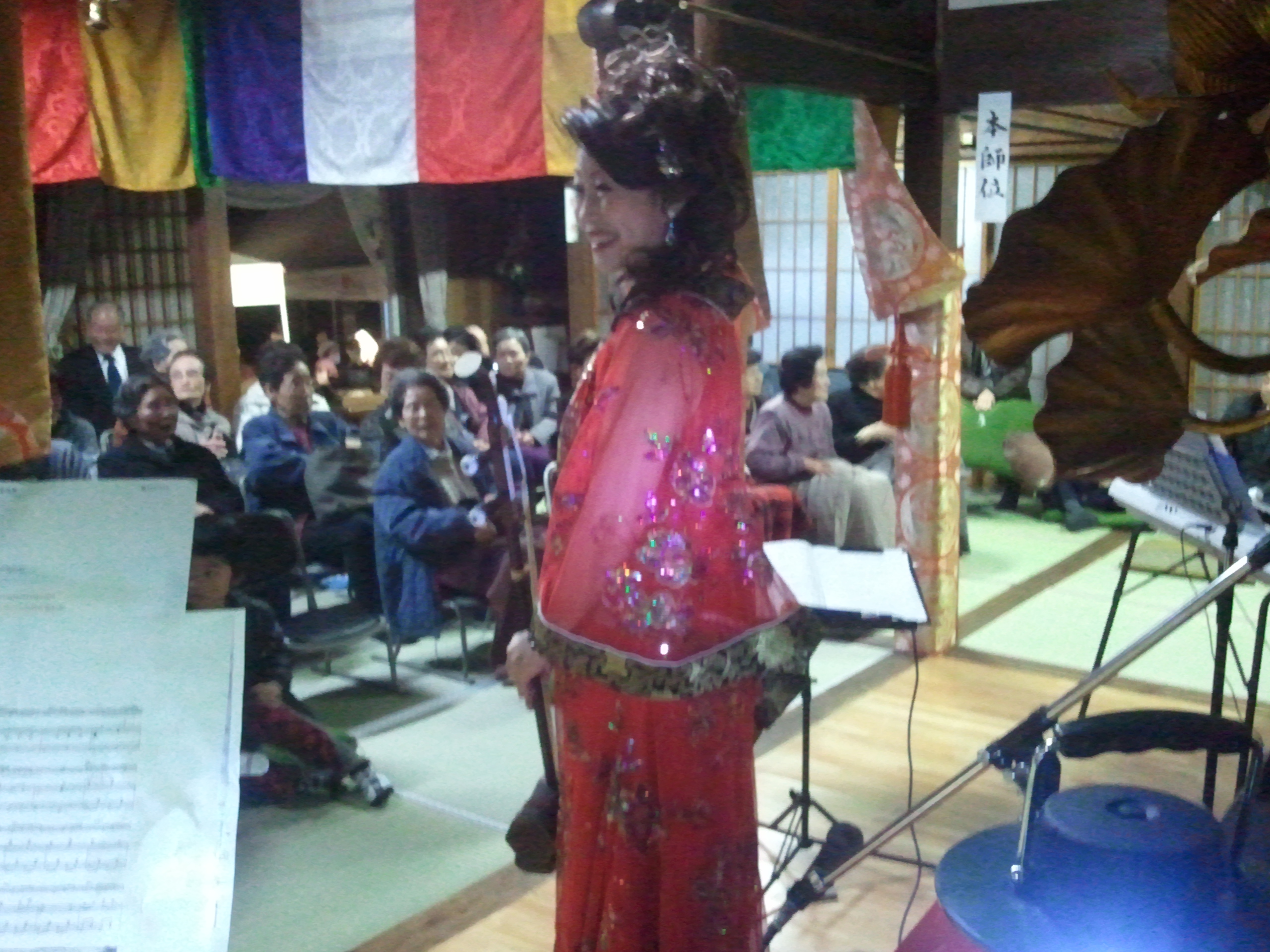 Kendohで御座います。 すっかり寒くなってきてテンションがた落ちな超寒がりな私でございます。 さて私、11月23日、24日と三重県第二宗務所の光明寺さんの晋山結制式へ行ってまいりました。 前日には三重梅花百観音霊場会40周年記念大会にも出演して下さった姜暁艶さんの、二胡の演奏会がありました。 二胡とはこんな楽器です。 姜暁艶さんはこんな方 姜暁艶HP 実は、出発前日の22日17:00頃に先光明寺さんへ行っていた師匠から電話がありまして、「お前も一緒に演奏しようって、姜さんが言うとるぞ」とのこと。 ・・・えっ!?・・・今日前日ですよね!? 姜さんと電話を代わって是非一緒に演奏しましょうと直のお誘い、「わ、わかりました」 と電話を切ったものの・・・えぇぇ!?どうすんの!? 曲も知らんし、リハもできなさそう。 当日曲とコード進行等を渡すと言われたのですが、バンドならともかく二胡とどうやって合わせていけばいいのだろう(;--) 不安や。 ということで、23日の昼過ぎに尾鷲市の光明寺様へ到着。 早速機材等の設営に取り掛かり、セットリストと楽譜を拝見。 ・・・11曲ありますよ!?でも楽譜は4曲分(;@@) ふむふむ、この4曲だけ参加すればいいのかな? 時間も無かったので、1曲だけリハをして後はぶっつけ本番です。 そして、首座入寺式と本則行茶も終わり、いよいよ演奏会です。 写真は二胡と私のギターの2ショット。 さて、姜さんが挨拶をして曲の始まる寸前に、「この曲はGです」 と一言。 ・・・そういうことか!? 私も完全即興で、Key=Gで弾きはじめました。 姜さん「次の曲はB♭です。」 私「はい」 こんな感じでワンステージをこなしていきました。 気づくと、セットリストと内容が大幅に異なっていました。 姜さんはそのときの雰囲気で曲目や演出を変えていくタイプの方だったんですね。 後で聞いたら即興演奏も大好きだそうです。 私も、曲の雰囲気を壊さぬよう、そして今回はあくまで二胡の演奏会なので二胡が引き立つように、邪魔をしないよにと極力ギターアンプのヴォリュームを抑えて、ここはギター要らないや、と思えば弾かず、何とか乗り切りました。 姜さんにも大変喜んでいただけてよかったです。 井尻憲導様 カッコいいでした 素晴らしいギター奏者と思います! 本当に素晴らしい走者でした! ^_楽譜なく、曲のキだけを一言で教えたらすべて雰囲気と合わせて頂きました。 非常に気に入りました。 感性は本当にプーローでした。 プロでした? 外来語は難しいだね 間違いたかも~ とにかくうまいギター奏者でした。 助かりました。 感謝 仏様の心をしっかりバンド皆様と一緒に響きください ありがとう Facebookでこんなメッセージもいただきました。 The Original Roadsは全員サングラスをかけてみては?とのアドバイスもww 演奏会後の様子です。 CD販売とサイン会 普段では中々経験できない貴重な体験でした。 最初はどうしよう、断ろうかな、なんて思っていましたが何事も経験。 参加させていただいてよかったですね。 光明寺様、姜さん、ありがとうございました。 さて、私も自分の自分の晋山に向けて頑張らねば(;+_+) Kendo |