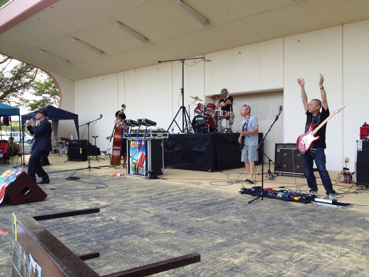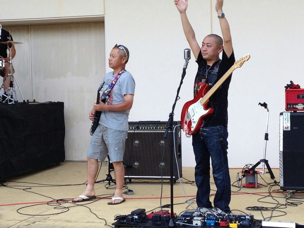 2013 / 07 / 23 ( Tue ) 海ダンス 勝手に夏フェス!! お疲れ様でしたぁぁぁ!! いやぁ、暑かったですねぇ。 そして、熱かった!! 身体はしんどかったですが、やったかいはありました。 いいイベントだったと思いますよ! 午前中は特に日差しが・・・。 でも、こんな感じでオーディエンスの方達にも楽しんでもらえたのでは? NOTORIOUS ROCKよりDJ Keisuke! 私のショットも。 飛び入りでこんな方も!! 私は、中学生の頃に1度御教示を賜ったことが御座います。 松阪が誇るスーパーギタリスト、Kondoh氏!! ・・・・・・・・・Kendohと似てる(笑) ・・・実は、私の自前の写真はほとんど無くて、嫁やDJ Keisuke君がFacebookにアップした写真を数枚流用させて頂いておりますm(__)m 我々、中年男達の体力が続く限り毎年やっていきたいですね(*^^*) 次回は9/14。松阪市は海禅寺さんでのライブ!! そして、その前にお盆が控えております!! まだまだ止まってなどいられません!! 頑張ってこの夏を乗り切りましょう!! 最後にいかにもイベントのバックステージっぽい写真で締めましょう!! それではまた。Kendohでした。 |