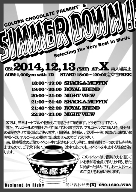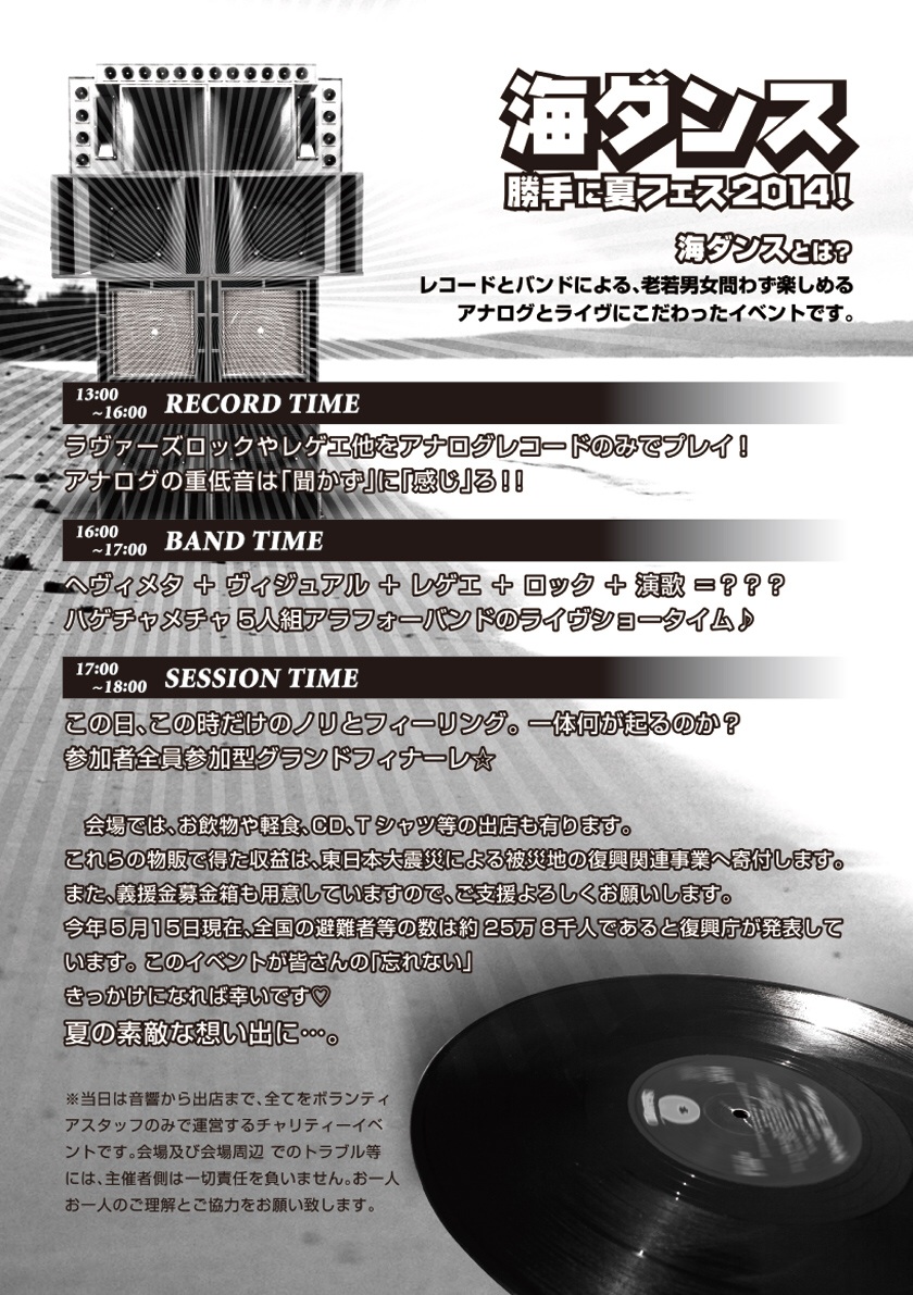 東日本大震災復興応援チャリティー音楽イベント♪ 海ダンス~勝手に夏フェス2013~ 7月21日(日) 13:00~18:00 @城ノ浜野外ステージ 入場無料 雨天決行/荒天中止 海ダンスとは? DJやバンドによる、老若男女問わず楽しめるジャンルレスな音楽イベントです。 13:00~14:00 SHACK-A-MUFFIN from MIE ダンサーとセレクターという異色のクルー「シャカマフィン」。1950年代にジャマイカのサウンドシステムで掛かっていたBLUSEやSOUL を中心にレコードでSelect。このイベントのオープニングを古き良き時代の音楽好きオヤジに贈る、大人の時間に演出します。 14:00~15:00 ROYAL BLEND from NARA 70's Early Reggaeを中心にRock Steady、Lovers Rock、Funky ReggaeなどをセレクトするOldies Selectors Crew. VINYL ADDICT !! 15:00~16:00 NIGHT VIEW from OSAKA LOVERS ROCKを広めるべく大阪は梅田のド真ん中に構えるオアシス『MAMBO CAFE』をアジトに活動を続ける第3世代LOVERS ROCKERS。 自分達の感性を研ぎ澄ましMELODY LINEにこだわった最高の音をDIGし続け、レコードBOXの中のコレクションは日々止まることなく増殖を続けている。 LOVERS ROCKを軸にSOUL、JAZZ等のBLACK MUSICを織り交ぜたジャンルレスなセレクトで独自のGROOVEを生み出していく。 2009年には日本最高峰LOVERS ROCKERS、SPECIAL REQUESTさんとのコラボMIXCD『SPEND SOME LOVERS ROCK TIME 001』も様々なレコード店で好評発売中。 16:00~17:00 Keisuke [NOTORIOUS ROCK] from FUKUI '07 DJ活動開始。'08福井県で行われているPOP DJイベント「PARASOL」に参加。同4月NORIOUS ROCKのRESIDENT DJとなる。 また'10年よりDJ SHUJIがオーガナイズするDance Music Party 「No Music No Life」に参加。 これまでに、やついいちろう(エレキコミック)、片平実(ROCK IN JAPAN FES DJ)、渡辺俊美(TOKYU No.1 SOUL SET)、クボタタケシ、森下くるみ、The New House、THE ZOOT16等との共演や田中宗一郎氏主催のCLUB SNOOZERへのゲスト出演。 最近のUK Rock / Indie danceを中心とした選曲には定評がある。 17:00~17:30 THE ORIGINAL ROADS from MIE リードギターのリーダーはゴリゴリのヘヴィメタ好き。サイドギターはヴィジュアル系。レゲエ馬鹿のベース。ドラムはロックンローラー。そして、ヴォーカルは梅○流師範!のハチャメチャ五人組アラフォーロックバンド!別名THE ZENZARS。誰もが聞いたことのあるロックな曲をオリロー風にカバーします。OLDIES BUT GOODIES !! 17:30~18:00 SESSION TIME 日本の夏といえば「ロック」!しかしロックと一言でいってもそのジャンルは様々。色んな「ロック」のつく音楽があります。ラストは出演者全員で「ロックな曲」の掛け合い!誰が一番会場を盛り上げるか?その場にいる全員で音を楽しみましょ~☆ 会場では、お飲み物やおつまみ、CD、Tシャツ等の出店も有ります。これらの物販で得た収益は、東日本大震災復興関連事業に寄付します。 また、東日本大震災義援金募金箱も用意しています。まだ16万人ぐらいの人が家に帰れないでいるという現状を忘れない為にも、このイベントが皆さんの「何かキッカケ」になれば幸いです。 その日、その時、その場にいる全員で、夏休みの素敵な思い出を作りましょう♪ ※当日はボランティアスタッフのみで運営する、チャリティーイベントですので、会場内及び会場周辺でのトラブル等には主催側は一切責任を負いません。お一人お一人のご理解とご協力をお願い致します。 後援/孫太郎オートキャンプ場、ホテル季の座、GOLDEN CHOCOLATE 主催/勝手に夏フェス2013実行委員会 |